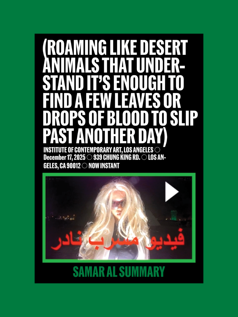 Roaming like desert animals, we understand it’s enough to find a few leaves or drops to slip past another day is a film screening program featuring artworks selected by Los Angeles-based artist Samar Al Summary, whose exhibition, Excavating the Sky, is currently on view in ICA LA’s Project Room. The program brings together work by artists from across the Middle East and North Africa who, like Al Summary, embrace the medium of film as a form of documentation, resistance, remembering, and imagination and a tool by which to cross the boundaries and borders that might otherwise keep us apart.