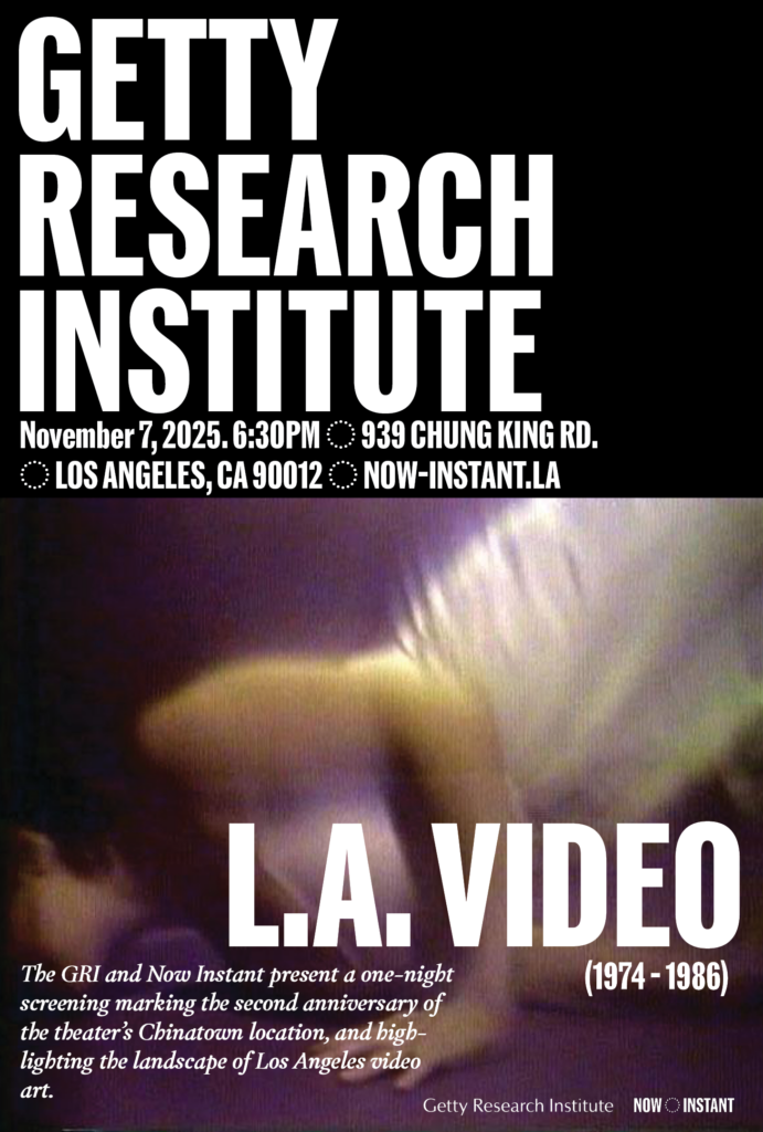 Pulling from the Getty Research Institute’s vast archive of video art, the GRI and Now Instant present a one-night screening marking the second anniversary of the theater’s Chinatown location, and highlighting the landscape of Los Angeles video art. Co-curated by Lauren Ardis of the GRI.